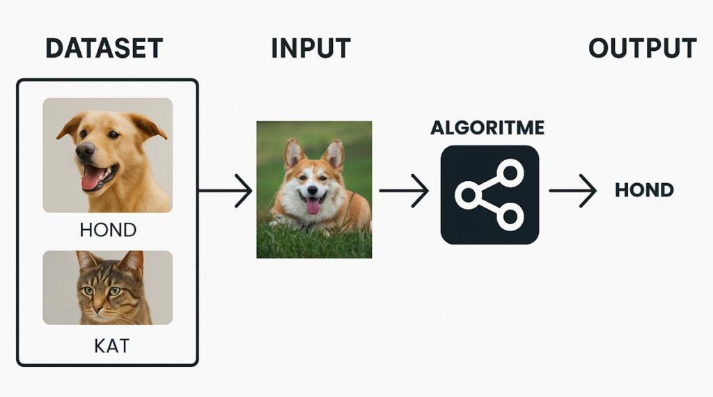 Een model leert door voorbeelden te zien. Bij fotoherkenning ziet het veel beelden van katten en honden en leert wat de verschillen zijn. Bij taalmodellen ziet het enorme hoeveelheden tekst en leert het hoe taal in elkaar zit.